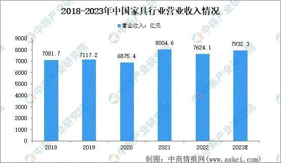 數(shù)據(jù)顯示,2022年受疫情和外貿等因素影響,我國家具行業(yè)規(guī)模以上企業(yè)實現(xiàn)營業(yè)務收入7624.1億元,同比下降-4.8%。回顧2018-2022年家具制造業(yè)營業(yè)收入情況:近年來,我國家具制造業(yè)營業(yè)收入總體呈小幅度下降趨勢,預計2023年我國家具行業(yè)復蘇營業(yè)收入將達7932.3億元。