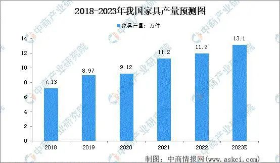 作為全球家具生產中心,早在2006年中國家具產業(yè)產值已躍居世界第一位,中國已然成為世界家具生產、消費及出口大國。2022年我國家具業(yè)產量11.9萬件,同比增長5.9%。預計2023年我國家具行業(yè)產量將達13.1萬件,同比增長10.05%。