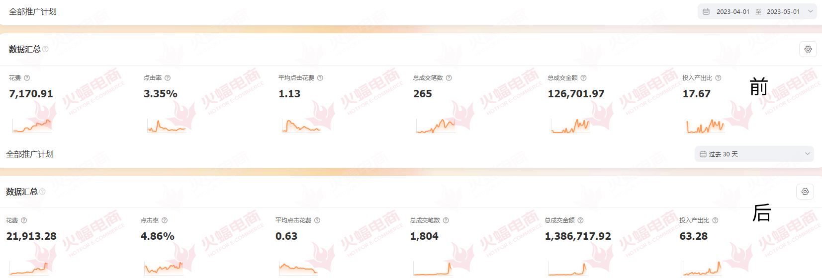 在方法上,用“標(biāo)準(zhǔn)計(jì)劃”提升搜索權(quán)重,用“智能計(jì)劃”完成轉(zhuǎn)化。在策略上,針對(duì)競(jìng)品及時(shí)做出反擊。例如,競(jìng)品用贈(zèng)品形式提高轉(zhuǎn)化,變相降價(jià),火蝠電商運(yùn)營(yíng)人員光隙(花名)則在贈(zèng)品外還加上套裝,進(jìn)而提高客單價(jià)。在多維運(yùn)營(yíng)之下,帶動(dòng)店鋪整體銷量提升。經(jīng)過為期30天的整體計(jì)劃,投產(chǎn)比從17逐漸提升到63,翻了3倍不止。