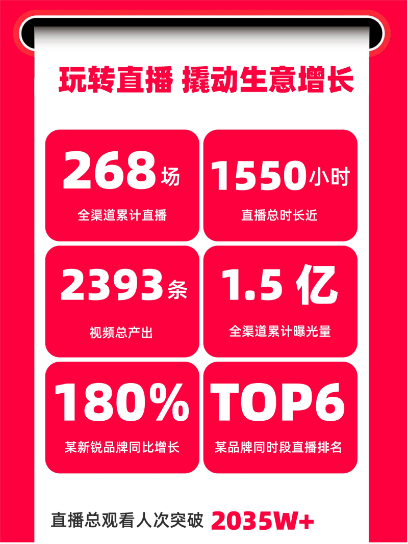 內(nèi)容營銷方面,憑借高效資源整合、溝通場景的精準(zhǔn)打造和創(chuàng)意內(nèi)容匹配。本次雙十一,火蝠電商在“直播”和“短視頻”上持續(xù)發(fā)力,全網(wǎng)累計(jì)曝光量超1.5億,全渠道累計(jì)直播場次達(dá)268場,直播觀看人數(shù)超2035萬,視頻總產(chǎn)出量、品牌全渠道曝光等方面數(shù)據(jù)表現(xiàn)突出。