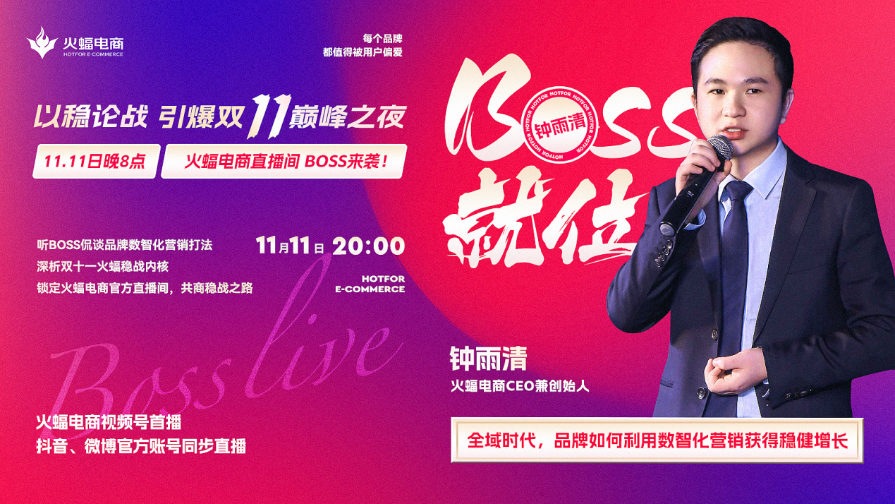 11月11日晚8點,敬請關注火蝠電商視頻號官方直播間,與火蝠電商CEO鐘雨清一起「穩戰」破局,引爆雙十一巔峰之夜。